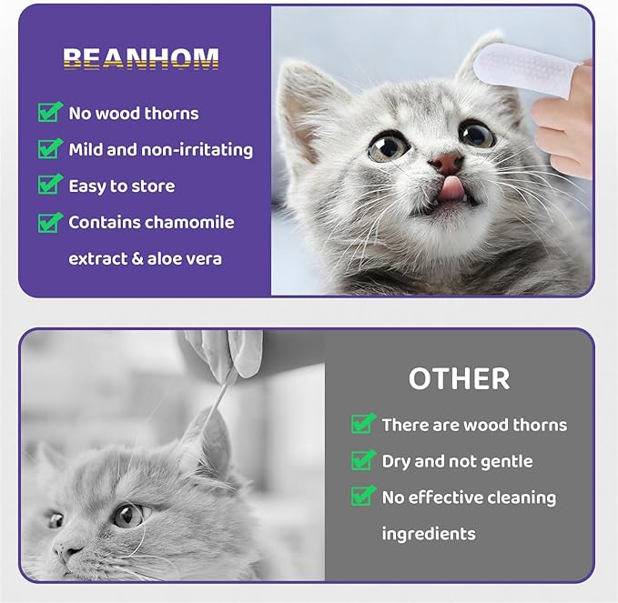• INDIVIDUAL FINGER SHEATH WIPES: Our Ear Wipes are convenient pre-moistened finger sheath wipes that allow you to get deep down into the hard-to-reach areas of your dog’s ear. Crafted from high-quality 100% biodegradable plant fibers, our dog ear cleaning wipes are gentle and soft on the skin. Easy to clean pet's ears and save time, which is comfortable for dogs.