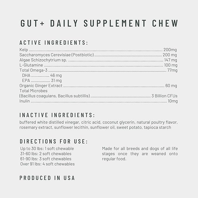 • Active Ingredients : Active Ingredients: Prebiotics, Probiotics, Postbiotics (Saccharomyces Cerevisiae), Algae Schizochytrium, Kelp, DHA, EPA, L-Glutamine, Ginger Extract. Inactive Ingredients: Purified Water, Buffered White Distilled Vinegar, Citric Acid, Coconut Glycerin, Natural Poultry (Chicken) Flavor, Rosemary Extract, Sunflower Lecithin, Sunflower Oil, Sweet Potato, Tapioca Starch. Active Ingredients: Prebiotics, Probiotics, Postbiotics (Saccharomyces Cerevisiae), Algae Schizochytrium, Kelp, DHA, EPA, L-Glutamine, Gi… See more