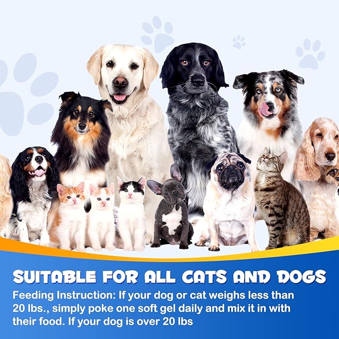 • 🐕🐶 Usage & Notes - Our dog support supplement omega-3 fish oil is suitable for small, medium, and large breed dogs. We recommend that the dog is under 20 lbs with 1 soft gel, 20-40 lbs with 2 soft gels, 41-60Ibs with 3 soft gels, 61-80 lbs with 2 soft gels, over 80lbs with 5 soft gels. Notes: Please note that this product is not intended to diagnose, treat, cure, or prevent any disease.