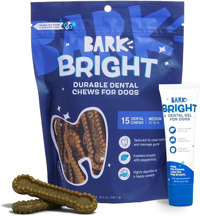 Bark Bright Durable Dental Chews Kit - Dog Tooth Brushing Treatment with Teeth Cleaning Chew Sticks & Toothpaste - Plaque & Tartar Remover for Cleaner Teeth & Fresh Breath - Medium Breeds - 15 Chews