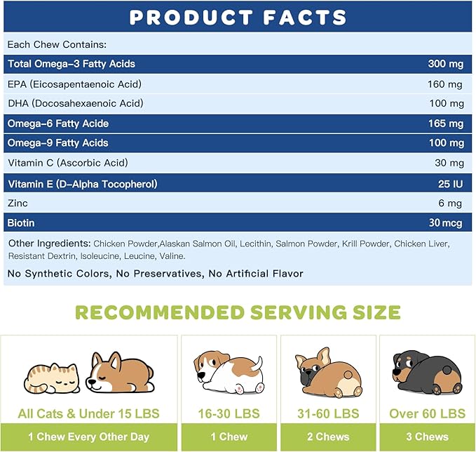 • Higher Level Formulations - Nature Target selects Wild Alaskan Salmon Oil for dogs as the sole source of natural omega-3 6 9 fatty acids. Contains 520 mg EPA + DHA per two chews, surpassing other brands. 120 Bites in the vacuum seal bag and shelf-stable jar. With special freeze-dried technology minimizes spoilage and maximizes ingredient activity and stability. Our salmon oil for cats & dogs are nutritious and delectable, ensuring your dog eagerly awaits their daily dose of essential nutrients.