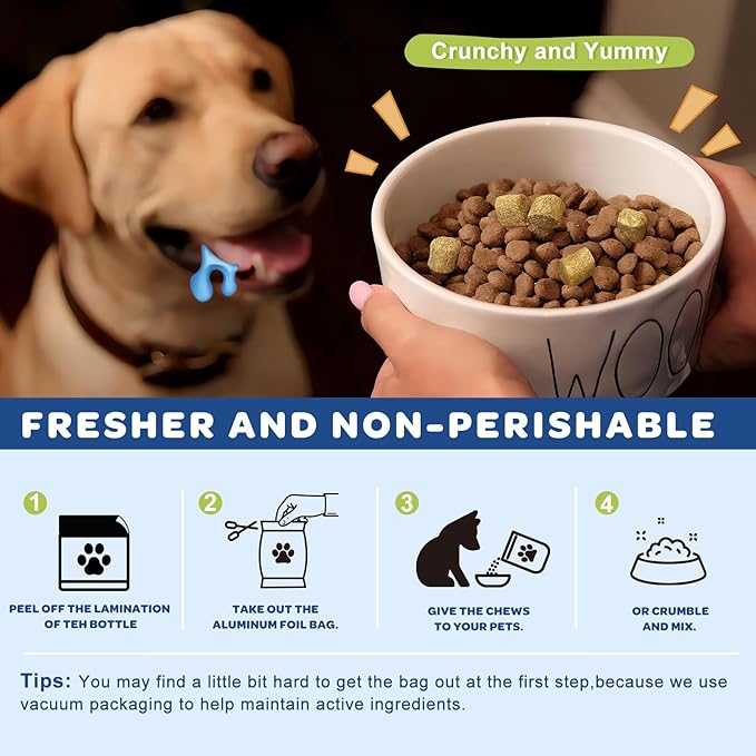 • Higher Level Formulations - Nature Target selects Wild Alaskan Salmon Oil for dogs as the sole source of natural omega-3 6 9 fatty acids. Contains 520 mg EPA + DHA per two chews, surpassing other brands. 84 Bites in the vacuum seal bag and shelf-stable jar. With special freeze-dried technology minimizes spoilage and maximizes ingredient activity and stability. Our salmon oil for cats & dogs are nutritious and delectable, ensuring your dog eagerly awaits their daily dose of essential nutrients.