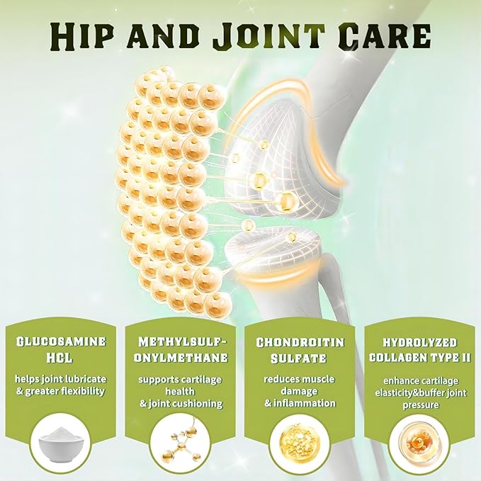 • Cartilage Health and Hips & Joints Care: Glucosamine helps cushion and lubricate joints. Chondroitin Sulfate supports healthy cartilage and shock absorption, MSM protects cartilage from degeneration and reduces joint pain, hydrolyzed collagen type II increases cartilage elasticity, and buffers joint pressure. The four best partners promote mobility and flexibility and strengthen hips and joints. TIP: our glucosamine is not sourced from shellfish, which avoids unnecessary dog allergies.