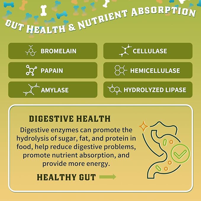 • Digestive & Skin and Coat Health: Due to the lack of digestive enzymes, food cannot be digested in time, causing some digestive issues. We have added 6 kinds of digestive enzymes, which can help to speed up and completely break down fat, protein and carbohydrates so that dogs can better absorb the nutrients they eat. Moreover, dog hip and joint supplement adds omega 5, to help our pet's itchy skin and ears, and licking paws, and support thicker, lustrous hair and beautiful coat.