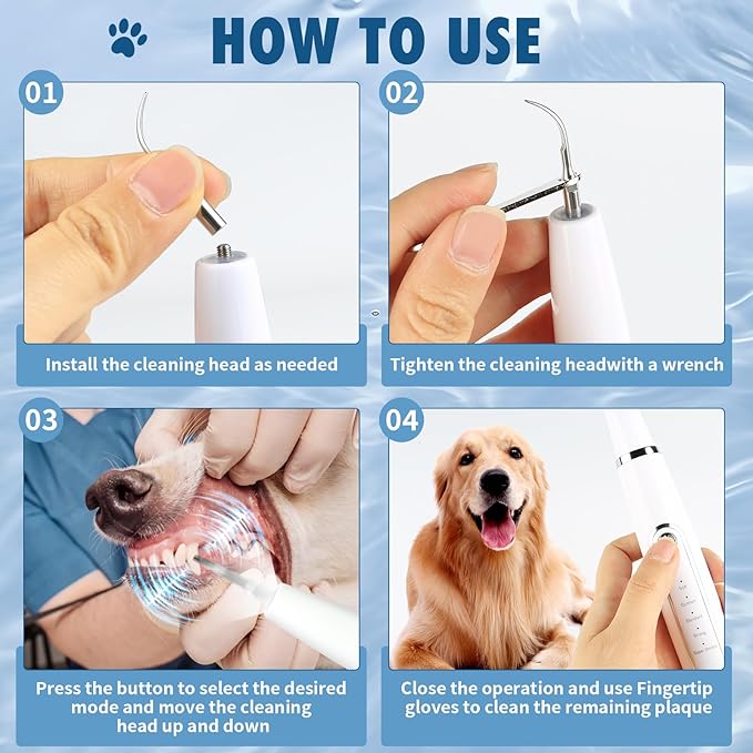 • 【Comfortable & Safe for Pet Care Solution】 The ultrasonic tooth cleaner utilizes high-frequency ultrasonic vibration technology to effectively remove tartar and plaque, while remaining gentle on your pet's mouth. And the dog teeth cleaner features a low-noise design, reducing potential stress or anxiety for pets. During use, you don't need to worry about your pet getting hurt, it automatically stops when in contact with the gums or soft skin, and starts vibrating and working when in contact with teeth.