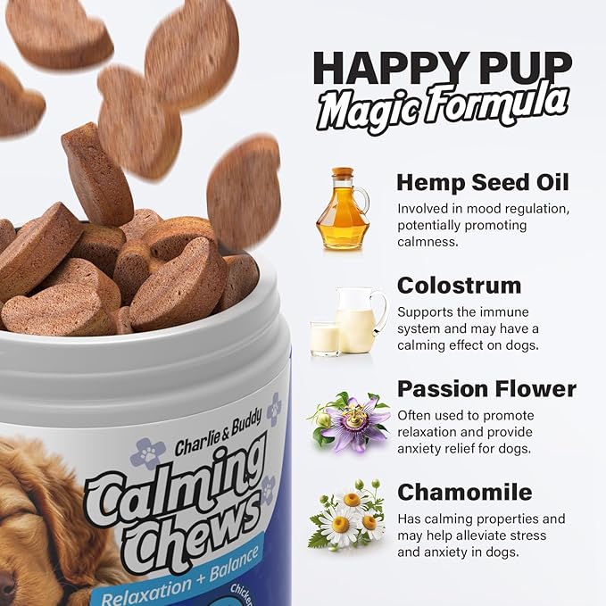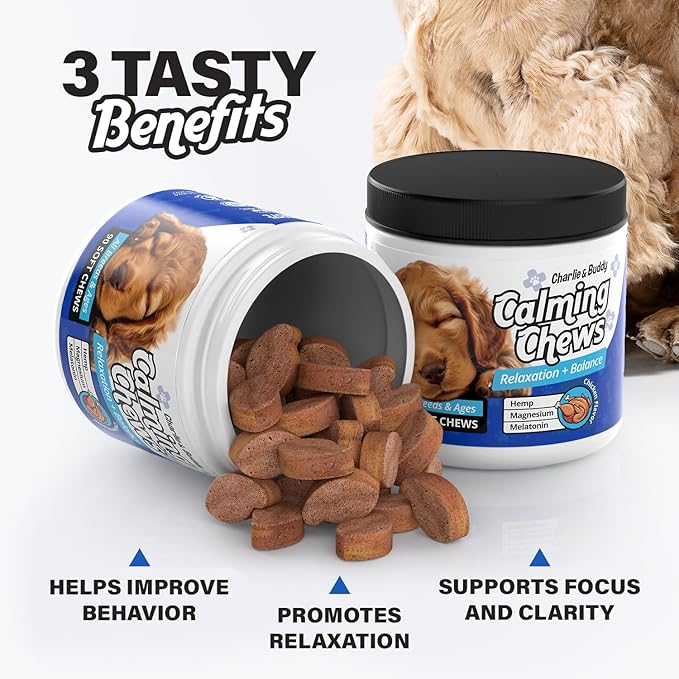 Charlie & Buddy Calming Chews for Dogs, Dog Anxiety Relief, Promote Relaxation, Dog Calming Chews with Melatonin for Dogs, Chamomile, Magnesium Citrate, 90 Soft Chews, Chicken Flavor