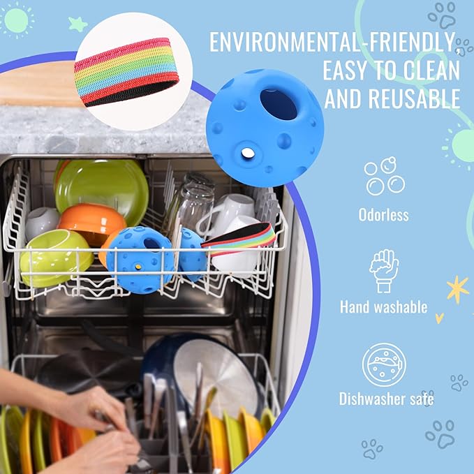 • [Easy to use and clean]——Rotate open the top lid, put the frozen dog food into the ball, then align it up and down and rotate to lock it to start playing. After playing, rinse the ball directly in water or put it in the dishwasher.