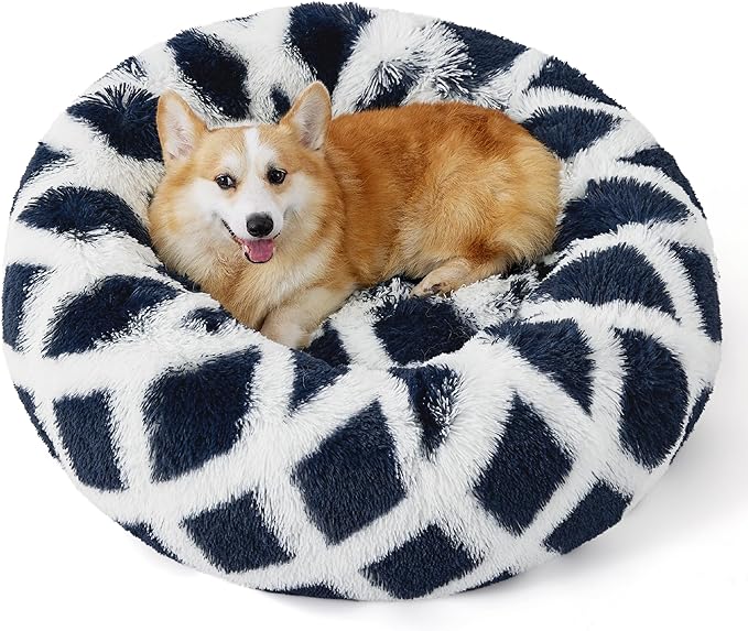Bedsure Calming Dog Bed for Medium Dogs - Donut Washable Medium Pet Bed, 30 inches Anti-Slip Round Fluffy Plush Faux Fur Cat Bed, Fits up to 45 lbs Pets, Diamond Blue