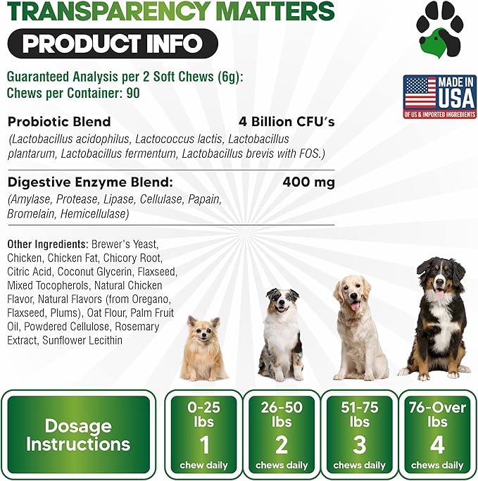 • Complete Digestive Health: Probiotic Chews for Dogs are formulated with a blend of dog probiotics and digestive enzymes, tailored to support gut flora and digestive health, making them the perfect canine probiotic for your pet's needs.