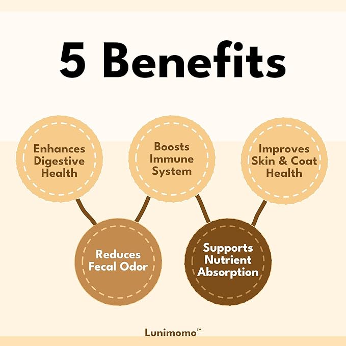• Advanced Gut Health Support: Lunimomo's Pre+Probiotics Pets is crafted with carefully selected probiotic strains that not only enhance gut health but also prevent diarrhea, improve nutrient absorption, and significantly reduce fecal odor, ensuring a healthier and more comfortable life for your pet.