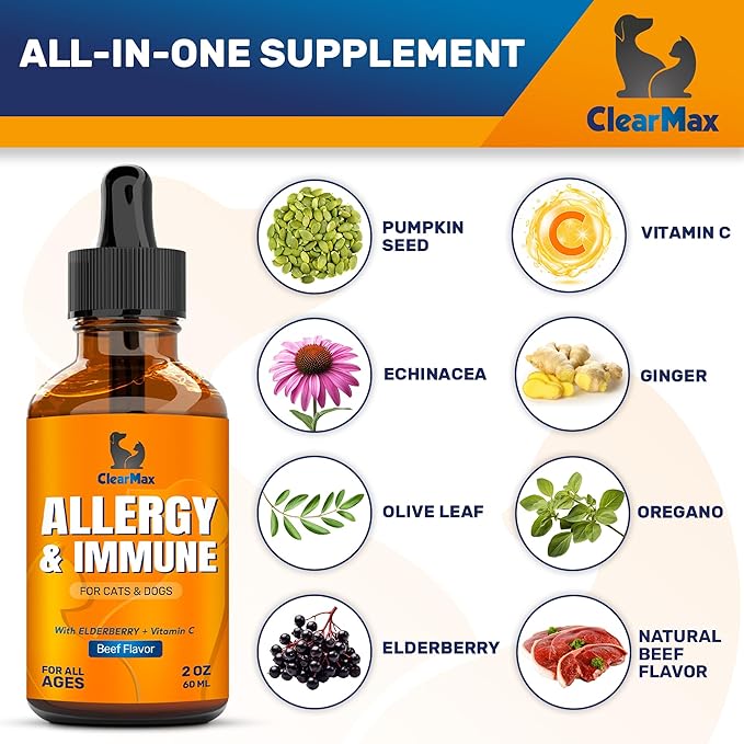 • 🔸COMPLETELY ORGANIC: This ClearMax Cat & Dog Allergy Support Product consists of Olive Leaf, Echinacea, Oregano, Pumpkin Seed, Elderberry, and Vitamin C as the main ingredients. No GMO!