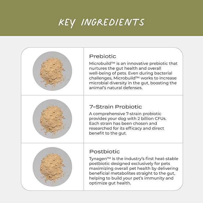 • POST, PRO AND PREBIOTIC FOR DOGS: These dog chews are crafted with an innovative prebiotic called Microbuild to nurture the gut health and overall well-being of pets, a comprehensive, research-backed 7-strain probiotic that provides your dog with 2 billion CFUs, and Tynagen, the industry’s first heat-stable postbiotic designed exclusively for pets. Tynagen helps to build your pet’s immunity and works to strengthen overall gut health.