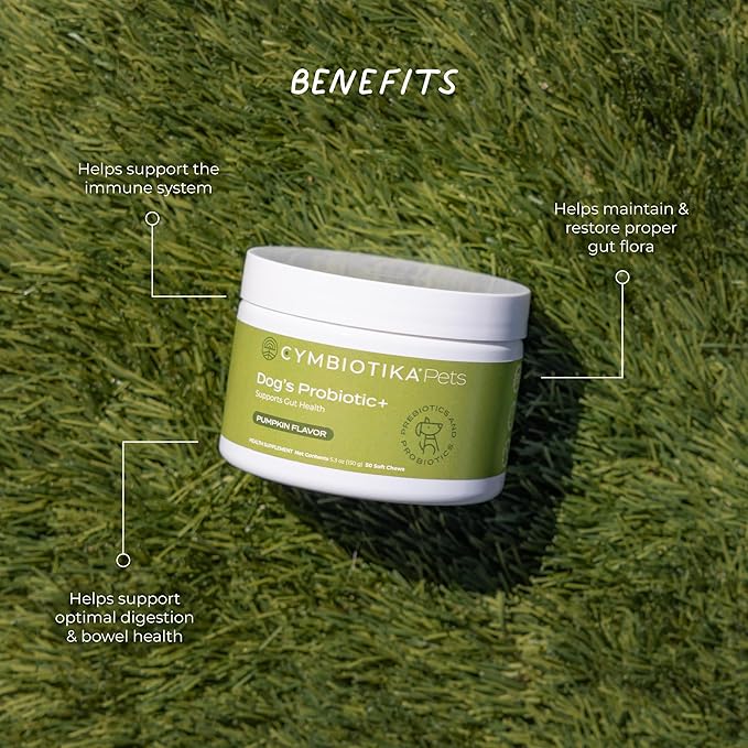 CYMBIOTIKA Dog Probiotic+, Probiotics for Dogs, Gut Health & Immune Support Supplement with Digestive Enzyme and Green Blend, Prebiotics, Postbiotics, Supplements for Dogs, Pumpkin Flavor, 50 Chews
