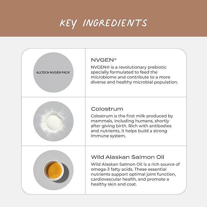 • DOG HEALTH SUPPORT: Our dog allergy support goes beyond aesthetics, and includes key ingredients to promote the overall well-being of your dog. AllTech NVGEN, a revolutionary prebiotic promotes immune health as well as a healthy gut surrounding, colostrum, rich with nutrients, helps to further build a strong immune system, and wild Alaskan salmon oil, rich in omega 3s can support dog joint and heart health.