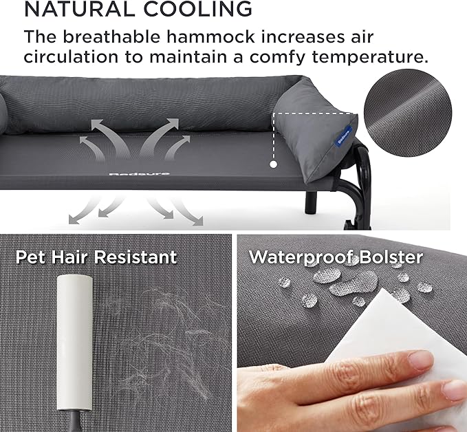 Bedsure Elevated Raised Outdoor Dog Bed - Cooling Dog Cot Bed with Bolster for Medium Dog, Lifted Pet Bed with Durable Breathable Teslin Mesh, Dog Hammock Bed with Non-Slip Feet, Grey, 32 inches