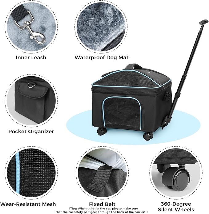 • HASSLE-FREE PET RELOCATION: Our Dog carrier is specifically designed for travel.The upgraded 360° rotating wheels provide a quiet and smooth ride, while the three-stage retractable button handle allows for adjustable height (up to 31"). Additionally, the adjustable shoulder strap with padding reduces shoulder pressure for added comfort. These features ensure that you can easily transport your furry friend in a fast and convenient manner.