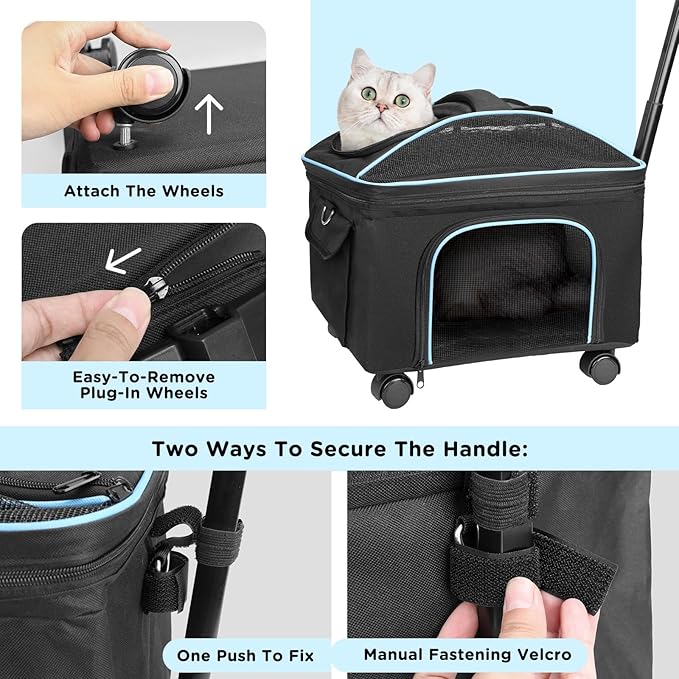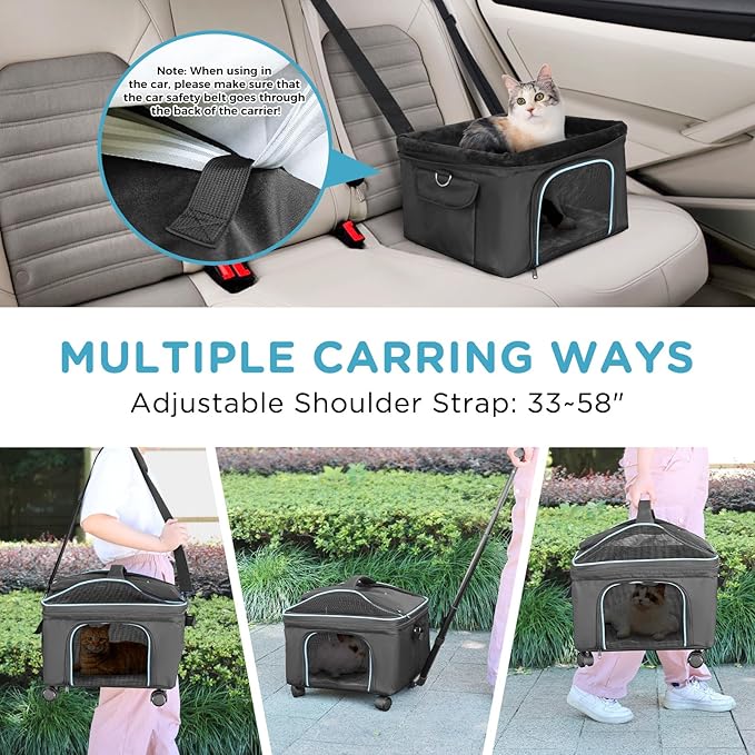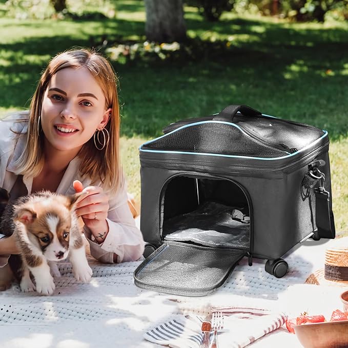 Airline Approved Cat Dog Carrier w Silent Wheel, Pet Carriers for Small Dogs Cats, Soft Travel Carrier Bag w Handle and Shoulder,Ideal for Outdoor (Black)
