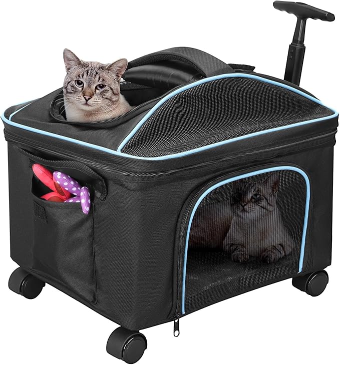 • AIRLINE APPROVED: Our Cat Carrier provides ample space for small and medium-sized animals, with dimensions measuring 15.7"(L) x 13.4"(W) x 11"(H) (with wheels). It can support up to 25 lbs, making it suitable for kittens or puppies. Furthermore, our cat travel carrier is airline approved. It conveniently fits under the front cabin seat, providing a comfortable and stress-free travel experience for your pet.