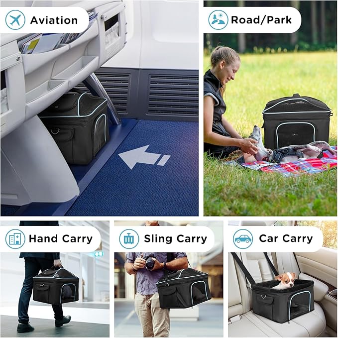 • USER-FRIENDLY DETAILS: Our Small Cat Carrier is perfect for various activities such as flying, traveling, camping, and outdoor adventures. Its portable and collapsible design makes it easy to store after use. Whether you're embarking on a flight or enjoying a camping trip, our dog carrier ensures that your pet accompanies you in a safe, comfortable, and pet-friendly manner.