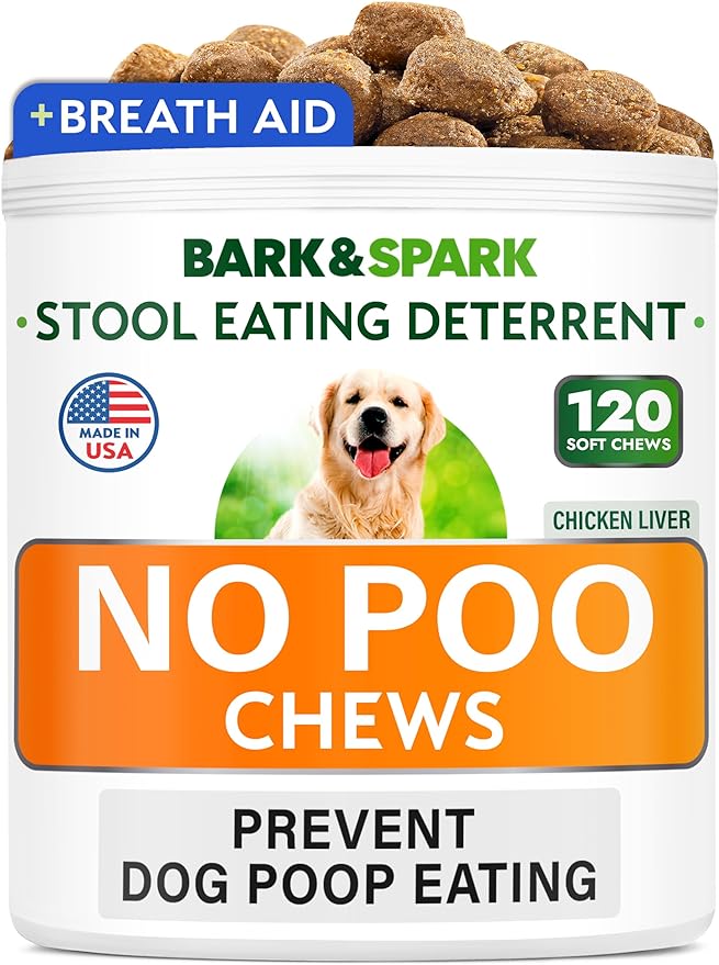 Bark&Spark NO Poo Treats - Prevent Dog Poop Eating - Coprophagia Treatment - Stool Eating Deterrent - Probiotics & Enzymes - Digestive Health + Breath Aid - 120 Soft Chews - USA Made - Chicken Liver