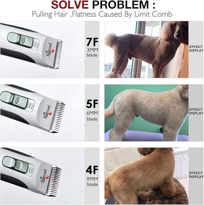 • 【4 replaceable length blades】 Use 4f (9mm) 5f (6mm) 7f (3mm)30f (1mm) trimming blades without the need for a plastic restraint comb. Now you can safely trim your pet at home, even if you've never done it before, without worrying about trimming your pet, easily changing blades to adjust to the optimal trim length. No skills required, the Precuttify dog trimmer does the rest, trimming at home has never been easier.