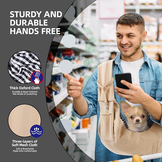 Dog Carrier Sling - Reversible Puppy Carrier Purse with Storage Pocket, Hand-Free Dog Sling Carrier for Carry Small Dogs and Cats,Travel Safety Harness, Dog and cat Harness (Apricot)