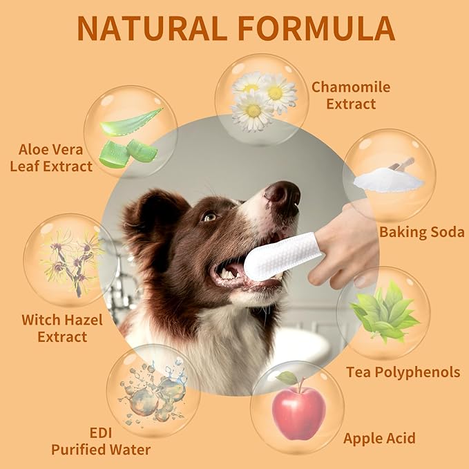 • 【Natural Formula】-- dog teeth cleaning finger wipes is formulated by Aloe Vera Leaf Extract, Baking Soda, Tea Polyphenols, Witch Hazel Extract, Chamomile Extract, Apple Acid. Effectively remove plaque, prevent tartar built-up, improves oral health, freshens breath.
