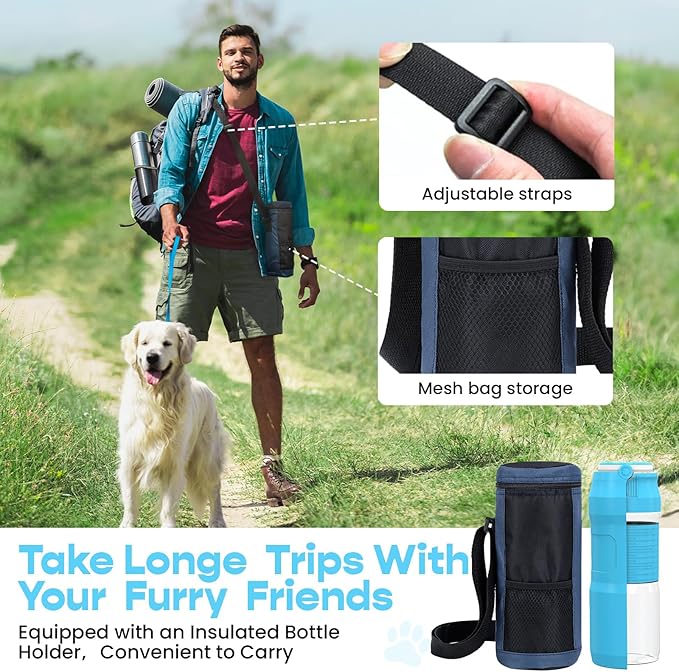 • 【Easy to Carry】: The foldable dog water bottle comes with an Insulated bottle holder, insulated carrier can keep the water cold or warm. It is great for your pet dog or cat when outdoor long walking, running, hiking, traveling or playing, etc. You can put it into the bottle holder, very easy to carry to anywhere you want.