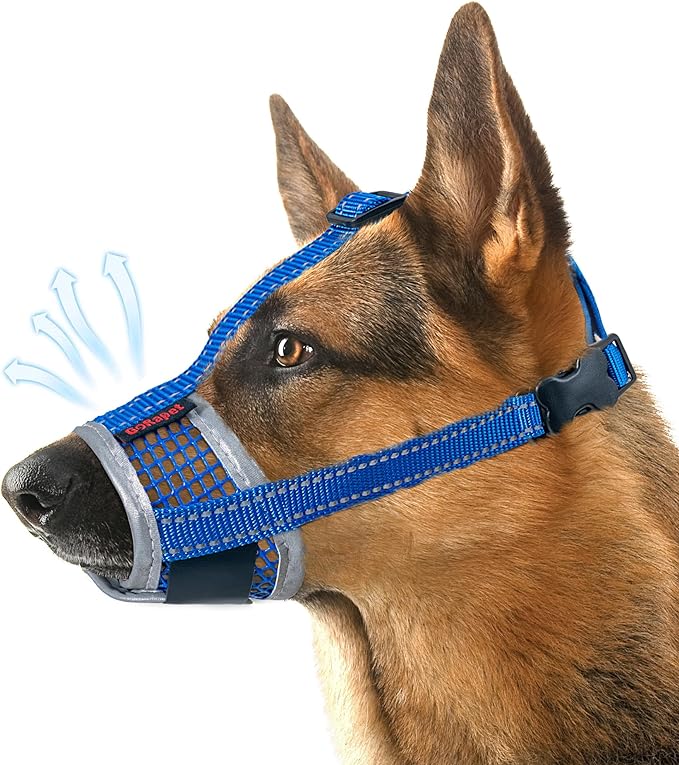 Dog Muzzle, Air Mesh Breathable Muzzle for Medium Large Sized Dogs to Anti & Prevent Biting Barking, Soft Grooming Muzzle for German Shepherd Dog with Reflective & Adjustable Strap(Blue-M