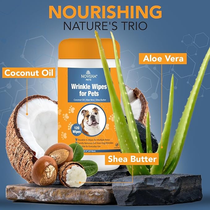 • NATURALLY HEALTHY PET SKIN - Infused with Aloe Vera and Coconut Oil, NOVEHA Wrinkle Wipes for dogs provide a soothing and hydrating experience for your dog’s skin, promoting comfort and vitality. Elevate your pet's well-being.