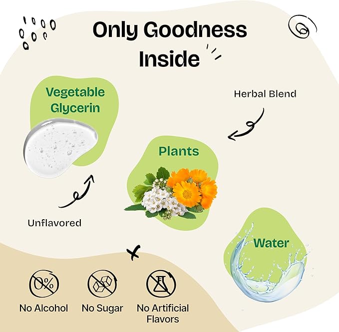 • Clean Formula: Our herbs, roots & seeds, purified water, and glycerin create a pure formula, free from sugar, alcohol, preservatives, artificial colors, or animal-derived ingredients.