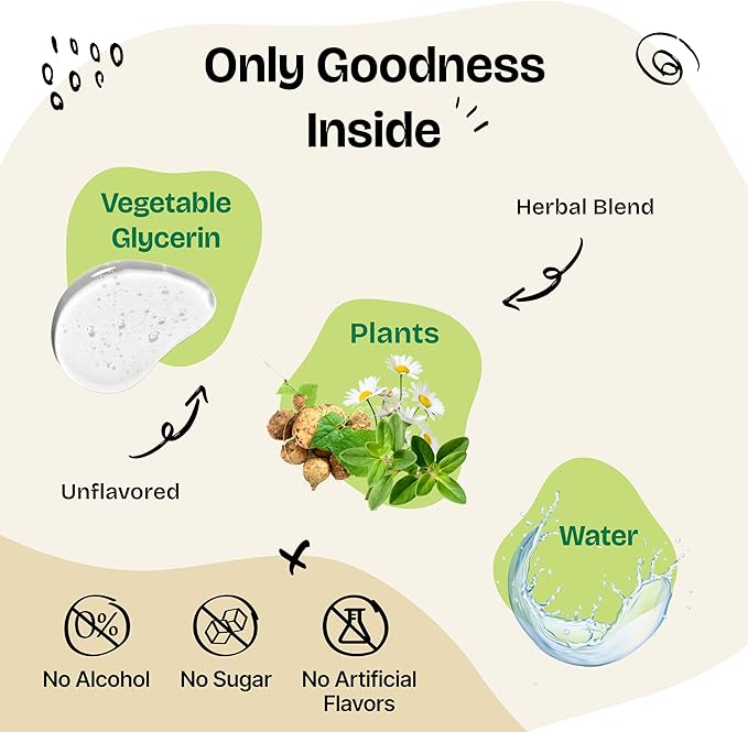 • Clean Formula: Our herbal blend, purified water, and glycerin create a pure formula, free from sugar, alcohol, preservatives, artificial colors, or animal-derived ingredients.