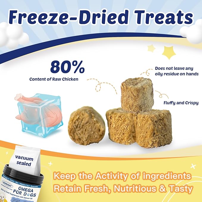• SUPERIOR TO SOFT CHEW OPTIONS: The chew is good alternative to liquid fish oil. Compared with the common soft chews on the market, we offer a superior choice. Utilizing freeze-drying technology, we remove all moisture to better preserve nutrients and flavors, making it less susceptible to spoilage or mold, and don't leave any oily residue on the hands when handling your dogs. Additionally, we package in aluminum foil bag, keep it from air, moisture, heat, and light. No need to refrigerate.