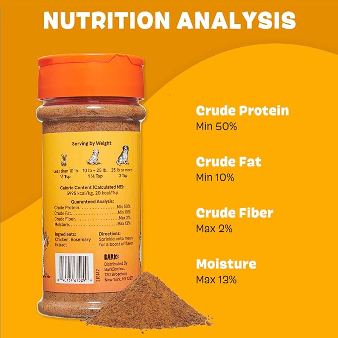 • Elevate Mealtime Magic with BarkBox Chicken Toppers: Experience the enchantment of our limited ingredient chicken topper – a culinary wonder that transforms every meal into a disappearing act! Simply sprinkle generously over your dog's kibble and witness the magic unfold as every last bite vanishes. Each shake introduces a burst of protein-packed flavor, enticing even the pickiest of pups to dive nose-first into their bowl.