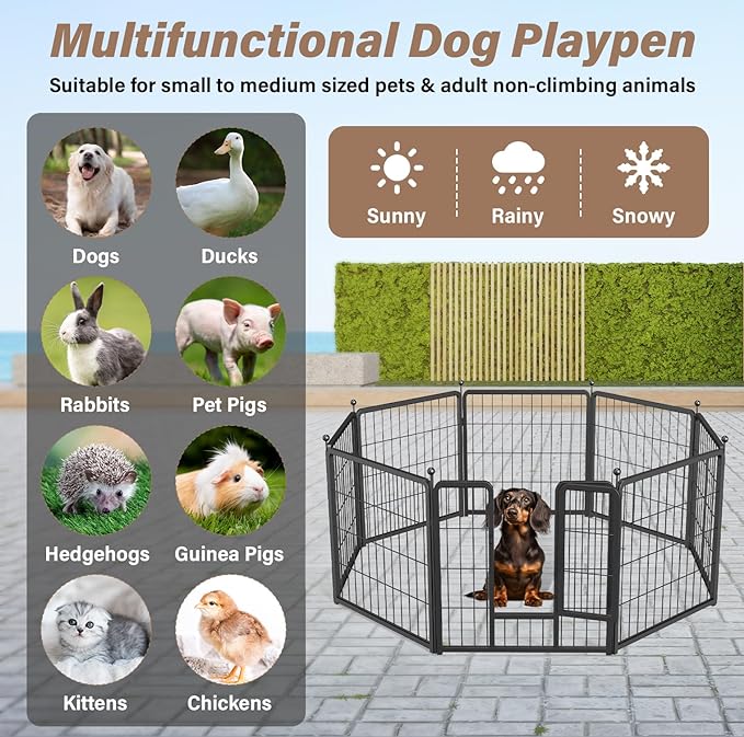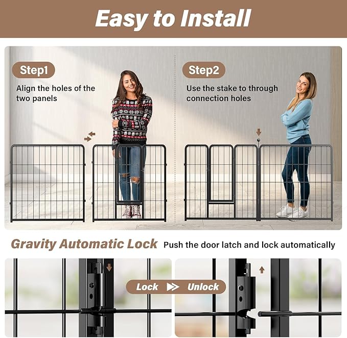 • 【Upgraded Dog Playpen】Dog playpen indoor adopts gravity door lock design, much safer and more convenient. Made of heavy duty metal panels and stakes with black coating, non-toxic, anti-rust. Ensures long time use no matter indoor or outdoor.
