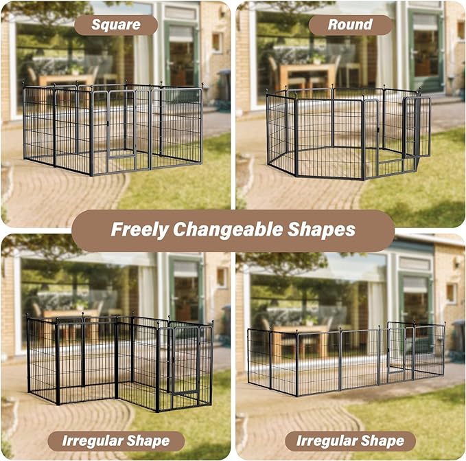 • 【Easy Assemble & DIY Shapes】Each panel is a separate piece. The panels could be assembled in just a few minutes without tools. You could DIY the dog pen to any shape you need, like square, rectangle, round, etc according to your house, garden or lawn.