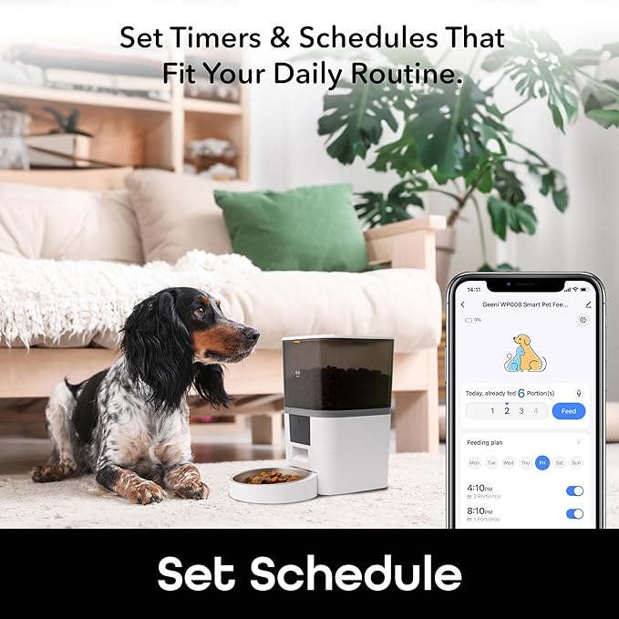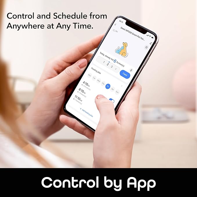 • SMARTPHONE PROGRAMMING WITH GEENI APP: Control meal times remotely via smartphone; program up to 15 meals with 1-50 portions per meal. Helps establish healthy eating habits. Works with the Geeni app, boasting over 500k reviews and a 4.8 star rating.
