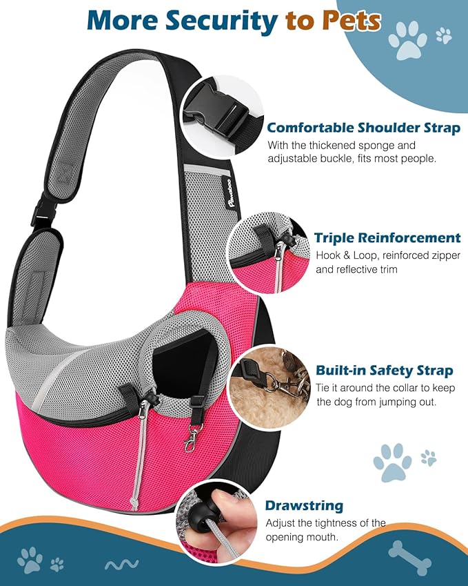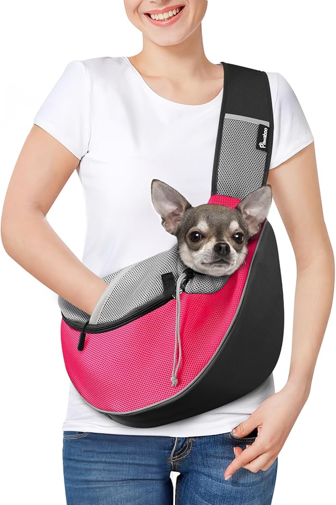 Pawaboo Dog Sling Carrier, Dog Papoose with Zipper Touch Pocket, Hand Free Breathable Mesh Puppy Carrier, Crossbody Satchel Dog Purse with Adjustable Strap for Outdoor Travel, Pink, Small