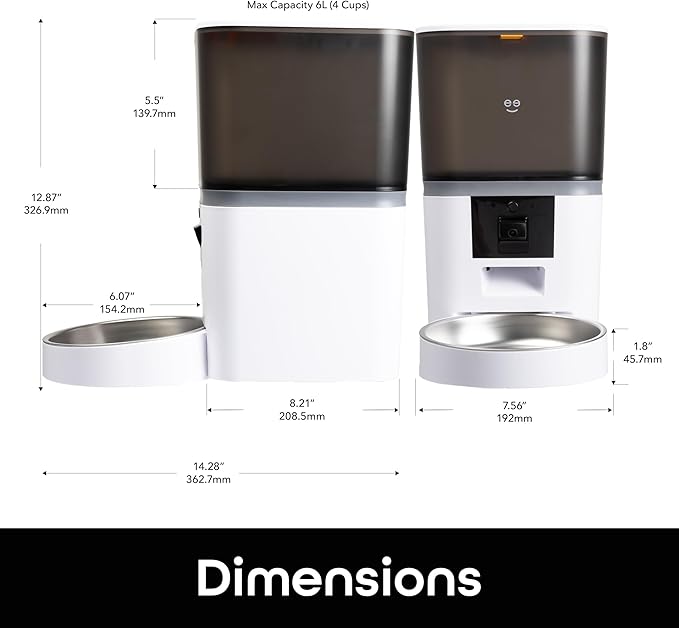 • Flexible Feeding Schedule: Set precise feeding times through the app with up to 15 meals per day and customizable portions. The 6L capacity ensures your pet is well-fed, helping establish a healthy eating routine.