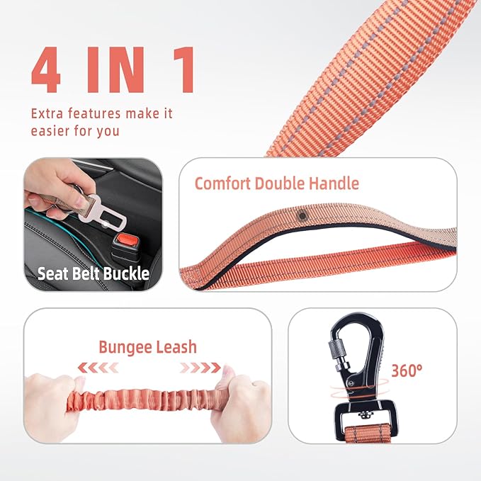 • 【Safety Belt Buckle】The bungee dog leash builts in a seat belt clip closer to the top handle for car rides! It can insert it directly into the seatbelt slot to ensure the safety of pets in the car, which really makes it an all-in-one leash.