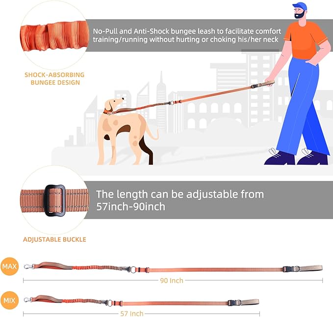 • 【Hands Free Dog Leash】Heavy duty leash material, allows for hands-free movement, providing a more comfortable and enjoyable experience for both you and your furry friend. The leash or belt aren't too heavy for you all, they're sturdy but light weight. Designed with the reflective strip for visibility at night. The bungee leash can be detached from the waist belt and used as a hand leash. It can also be used as a hand lead while still attached to the waist belt for extra security.