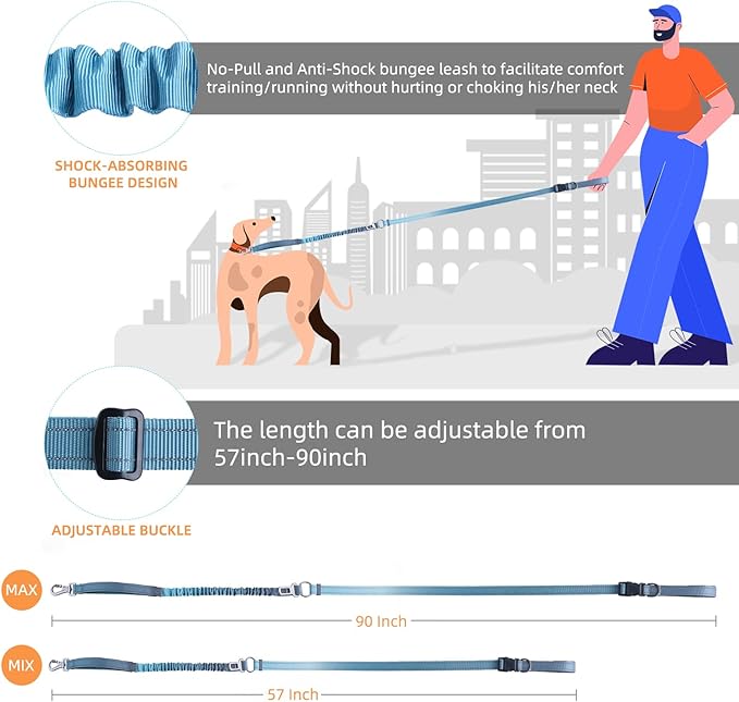 • 【Hands Free Dog Leash】Heavy duty leash material, allows for hands-free movement, providing a more comfortable and enjoyable experience for both you and your furry friend. The leash or belt aren't too heavy for you all, they're sturdy but light weight. Designed with the reflective strip for visibility at night. The bungee leash can be detached from the waist belt and used as a hand leash. It can also be used as a hand lead while still attached to the waist belt for extra security.