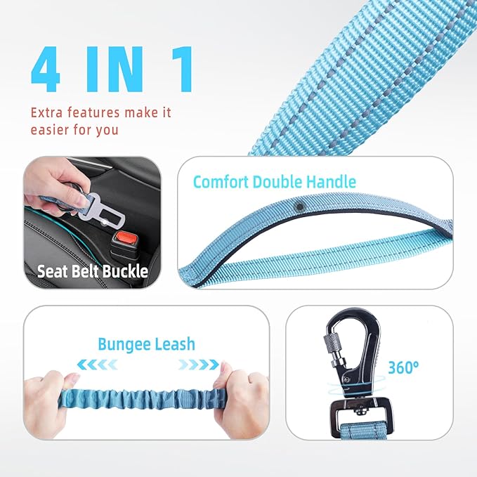 • 【Safety Belt Buckle】The bungee dog leash builts in a seat belt clip closer to the top handle for car rides! It can insert it directly into the seatbelt slot to ensure the safety of pets in the car, which really makes it an all-in-one leash.