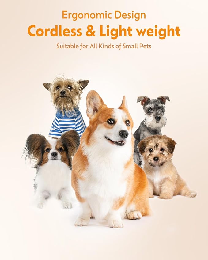 • ✔Ergonomic Design Hair Clippers Kit for Dogs: 🐶🐱Our Cordless dog trimmer is light weight, Rechargeable electric hair clippers for dogs with built-in battery make it flexible for you, Which allows you to trim your pet anytime, anywhere. You don't have to worry about tangled wires. This wireless hair clippers for dogs can be used for 1.5 hours after being re-charged for 2 hours. USB charging cable is provided, not the power adapter.
