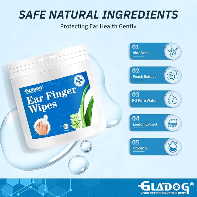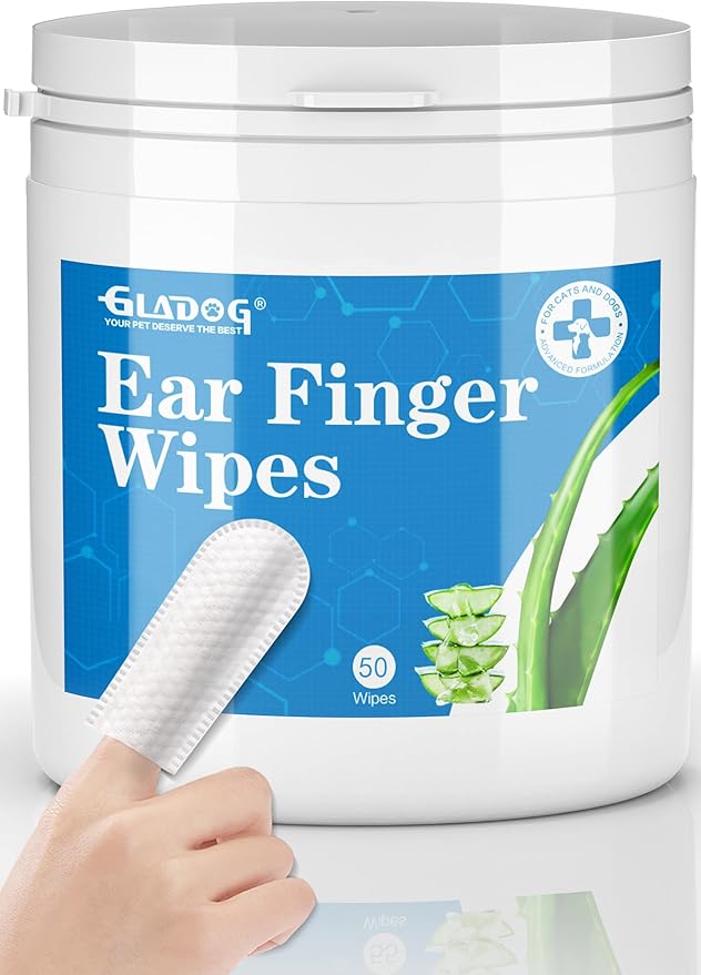 GLADOG Dog Ear Cleaner Finger Wipes, Ear Finger Wipes for Dogs Cats, Gently Removes Dirt & Odor, Dissolves Wax Build-Up, Easy to Use, Ear Cleaning Finger Wipes for Dogs (1.75in 50 Count)