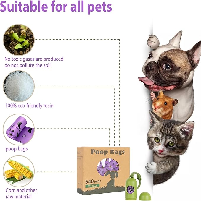 Dog Poop Bag Rolls - 540 Count Dog Waste Bags with Dispenser, Extra Thick Strong Leak proof Poop Bags for Dogs Doggy | Scented Purple