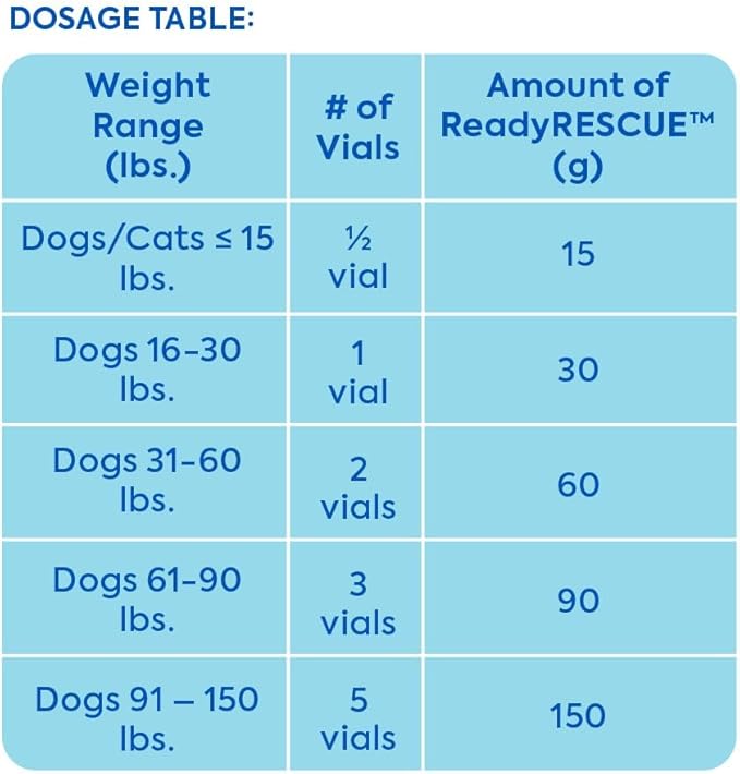 • EASY ADMINISTRATION: ReadyRESCUE can be easily mixed with pet food, drinking water, or a palatable pet favorite like peanut butter, making it simple and convenient for pet owners to use at home when danger strikes.