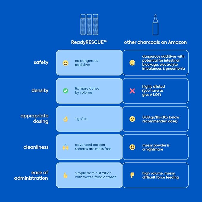 • HIGHLY EFFECTIVE: ReadyRESCUE is designed with activated carbon spheres, providing 6 times the absorptive power by volume, vs. other activated charcoals currently used by veterinary professionals.