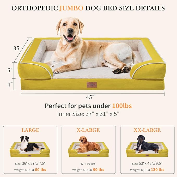Orthopedic Dog Beds, Jumbo Dog Bed for Extra Large Dogs, Waterproof Dog Bed, PV Washable Dog Sofa Bed with Removable Cover & Non-Slip Bottom(Jumbo,Spicy Mustard)