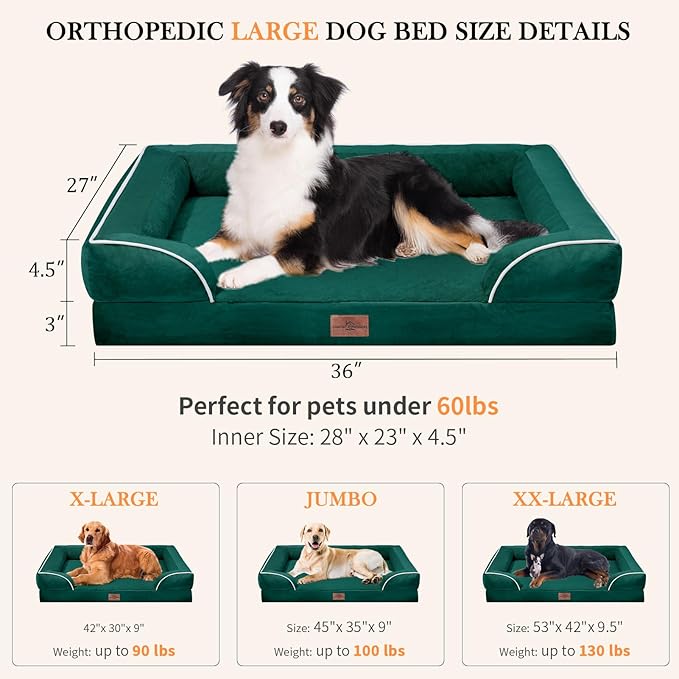 Orthopedic Large Dog Beds, Waterproof Dog Beds for Large Dogs, Comfy Washable Pet Bed Sofa with Removable Cover & Non-Slip Bottom(Large,Emerald)